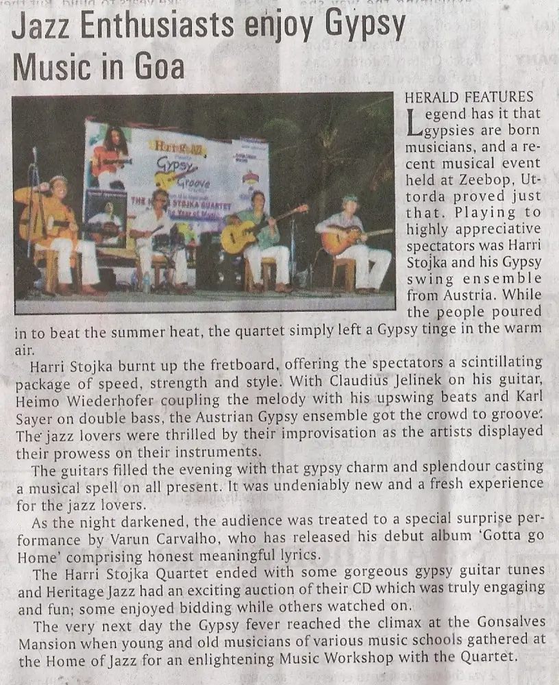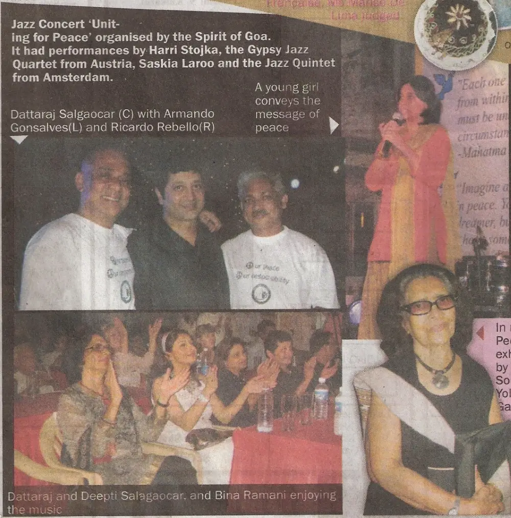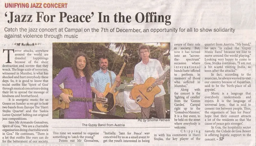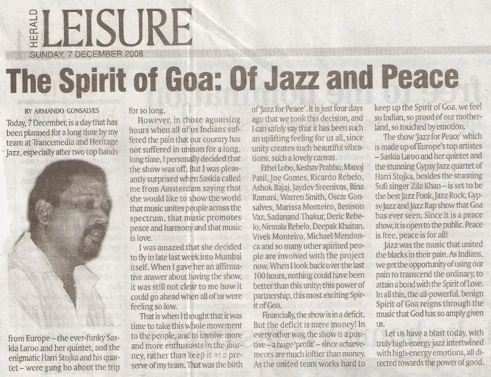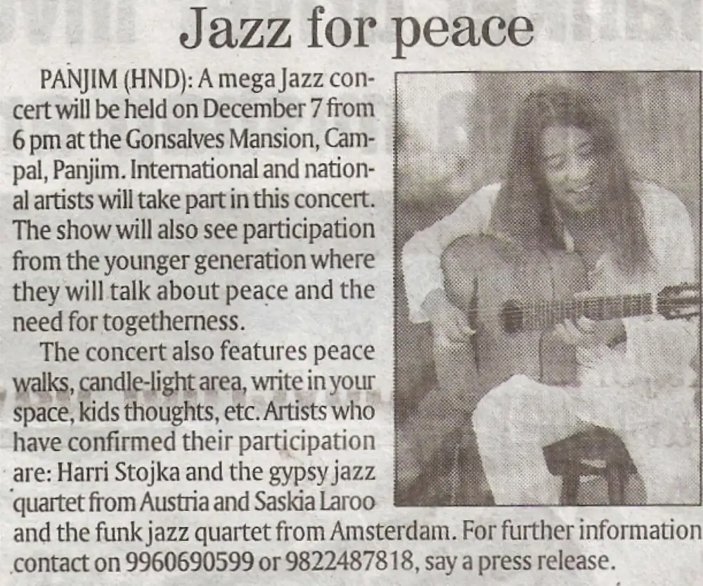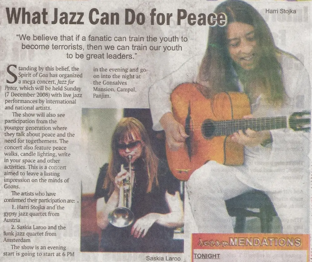 The Jazz for Peace show held in the streets near Gonsalves Mansion was an event that struck the heart, as an event of emotion, love, peace, togetherness and unity. Harri Stojka, considered to be the world’s best Gypsy jazz guitarist, started the event with popular numbers from the Gypsy almanac, and then graduated into music that was composed by him and his teammates. Saskia Laroo stunned the crowd with her brand of Jazz funk, jazz-rock and rap jazz that got the crowd on its feet. She was simply amazing, full of life and joie de vivre. She started off the concert with the number “It’s just jazz”, and then went on to mesmerize the packed audience with music that surprised all who were present. The streets of Campal were adorned with decorative lights, and the area wore a festive look. Before the commencement of the show, a two-minutes silence was observed in the memory of those killed in Mumnbai. Both Saskia and Harri spoke at the occasion and expressed pain at what had happened but also made it a point to mention that they were here to unite people through music