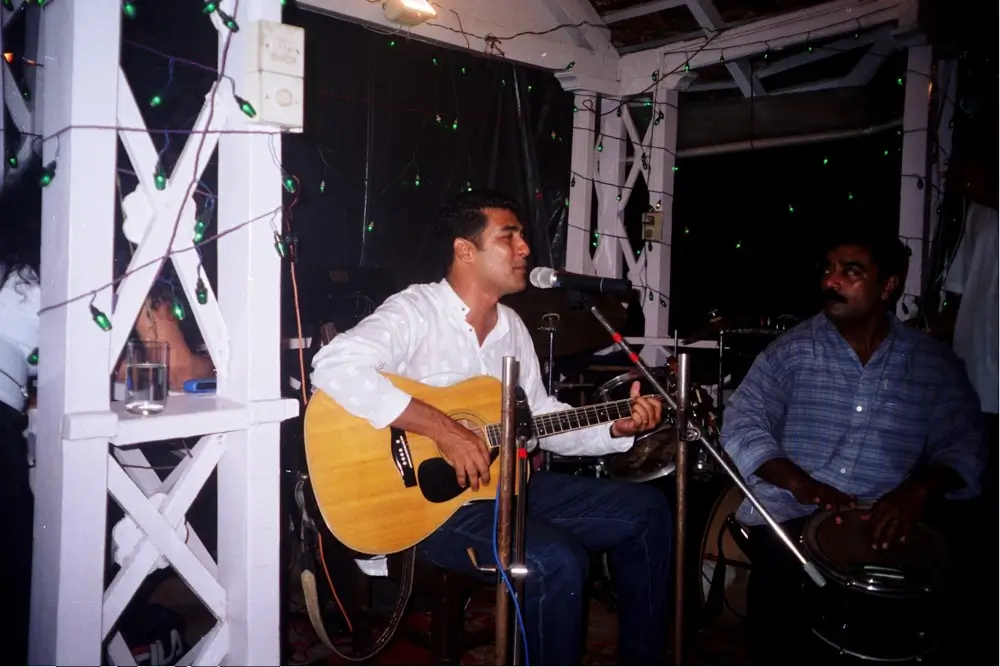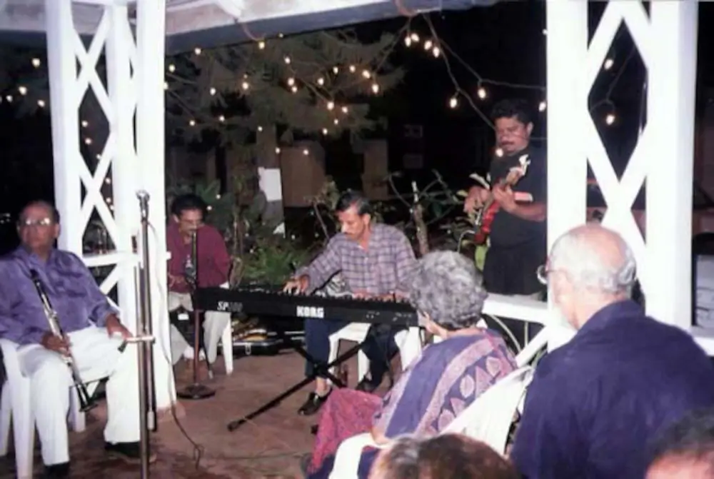 In December 2001, the show held on the 18 th was a spur-of-the-moment decision taken since everyone wanted to have a great start to the festive week that was just a few days away. And what a night it was. George Fernandez, Lester Godinho, Carlos Monteiro, Mac Dourado, Benny Rosario and a host of other local stars were seen in action, and so much was the action that the 33 metre long verandah of the home was fully occupied by jazz lovers who had come from all over. Those shows were completely free of charge and each one was more like a pound party where everyone pooled in with a drink here, some snacks there and a whole lot of bonhomie. The show was graced by Shaukat Baig who just landed up from nowhere. In any case, we did not know who he was till Valerio introduced him as his brother-in-law much to our delight. Shaukat is a wonderful musician and he played raga on the piano amongst so many other interesting numbers besides being absolutely fantastic on the mike. We were truly entertained by this wonderful entertainer.
