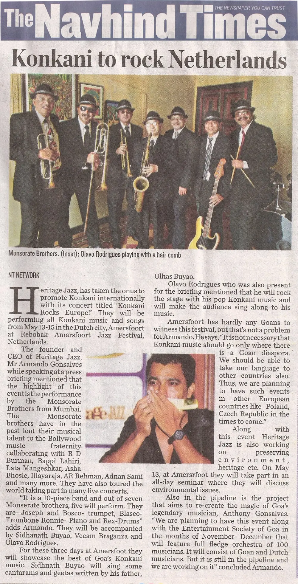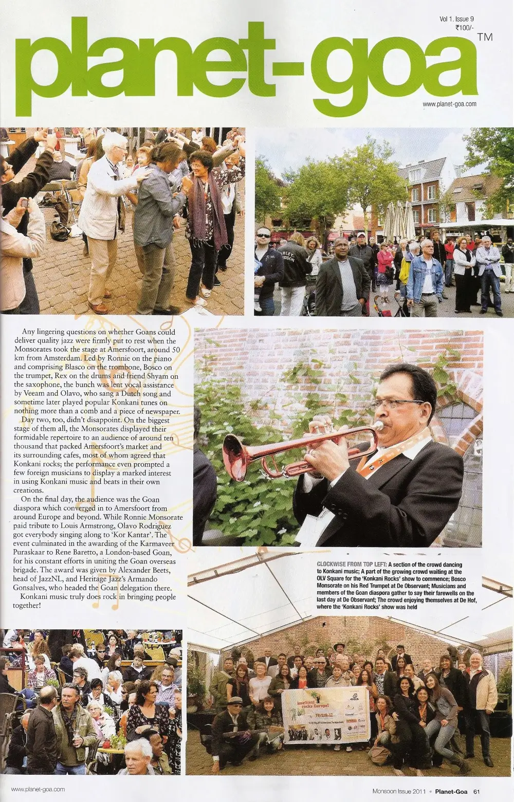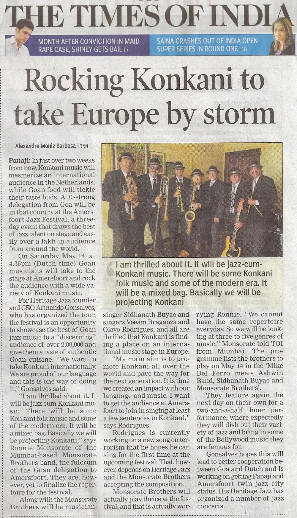 The Amersfoort Jazz Festival was held from 13th – 15th of May, 2011, at Amersfoort in the Netherlands. Heritage Jazz was a partner at this International Jazz Festival. The C.E.O. Armando Gonsalves , along with his immediate team attended this event. The dream of Konkani rocks dates back to December, when a dutch group of musicians were invited to Goa by Armando Gonsalves, the CEO of Heritage Jazz to perform Konkani numbers amongst Goans. That was when an idea sparked his mind to take Konkani to the world. The Rabobank Amersfoort International Jazz Festival created performance spots for international artists including our very own Goan artists led by the Monsorate Brothers along with Olavo Rodriguez, Sidhanath Buyao, Yatin Talaulikar and Veeam Braganza comprised of the team who set the mood on. The other performers included saxophonists Alexander Beets, Sigrun Jording, Koh Saxman, and DJ Nakadia. From foreigners to our own goans groved to the beats of Konkani music.