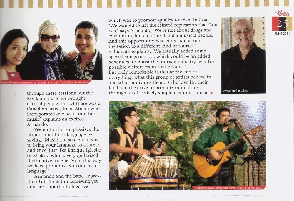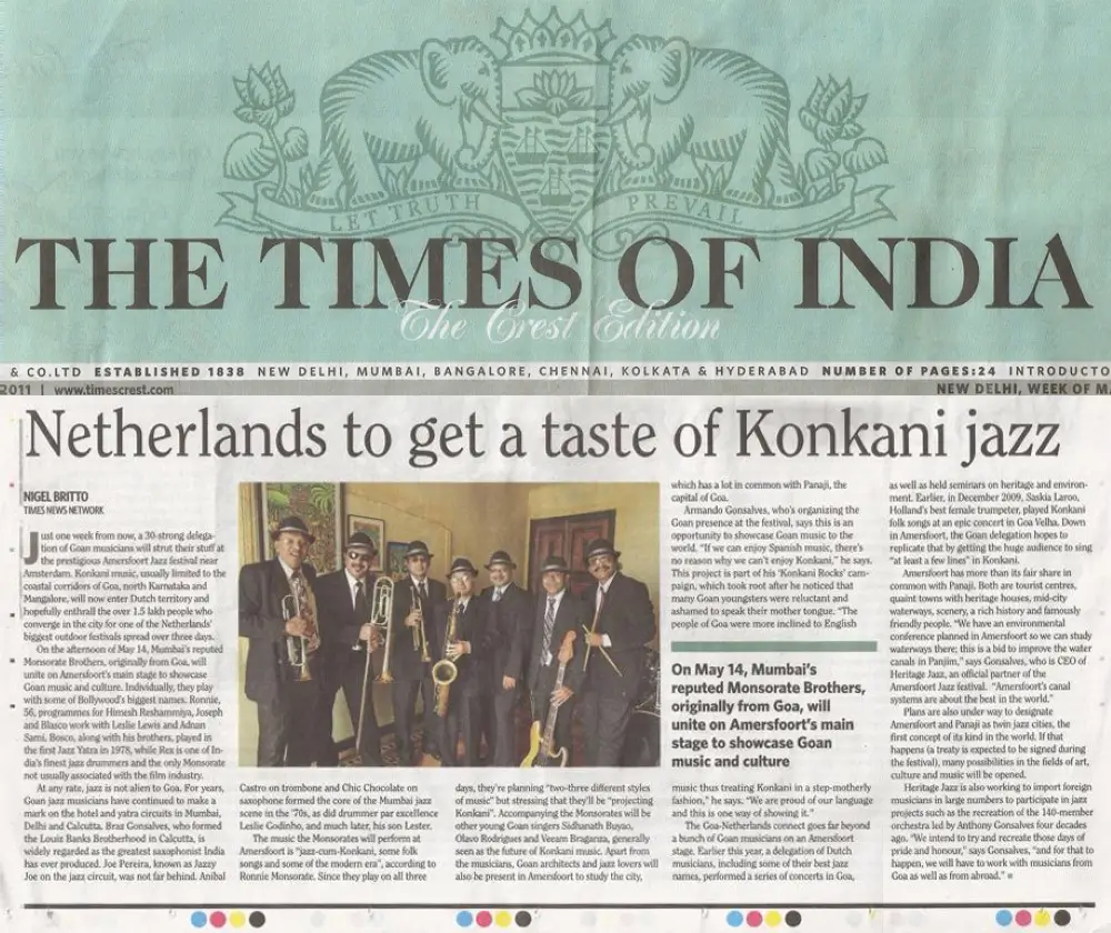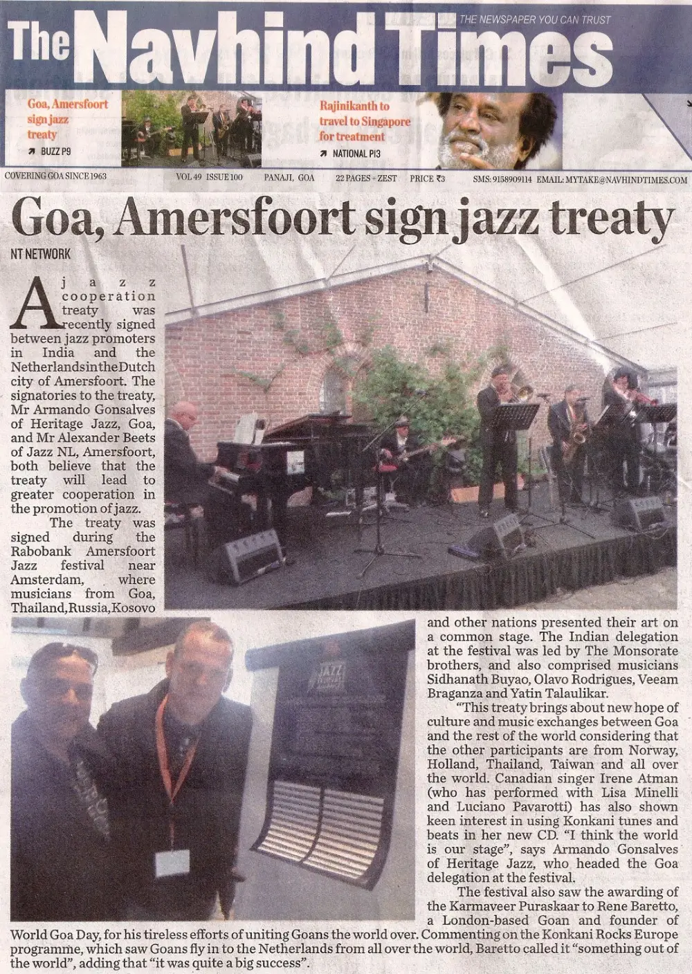 The Amersfoort Jazz Festival was held from 13th – 15th of May, 2011, at Amersfoort in the Netherlands. Heritage Jazz was a partner at this International Jazz Festival. The C.E.O. Armando Gonsalves , along with his immediate team attended this event. The dream of Konkani rocks dates back to December, when a dutch group of musicians were invited to Goa by Armando Gonsalves, the CEO of Heritage Jazz to perform Konkani numbers amongst Goans. That was when an idea sparked his mind to take Konkani to the world. The Rabobank Amersfoort International Jazz Festival created performance spots for international artists including our very own Goan artists led by the Monsorate Brothers along with Olavo Rodriguez, Sidhanath Buyao, Yatin Talaulikar and Veeam Braganza comprised of the team who set the mood on. The other performers included saxophonists Alexander Beets, Sigrun Jording, Koh Saxman, and DJ Nakadia. From foreigners to our own goans groved to the beats of Konkani music.