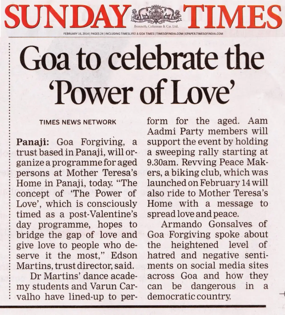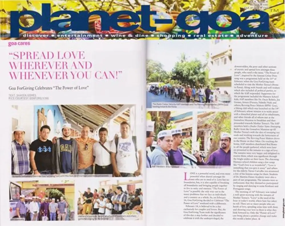 February 14th, is generally made out to be a day of love celebrated between lovers and couples. But, we at GoaForgiving, celebrated “The Power of Love” in our own special way at Mother Teresa’s Home in Panjim. We chose to spend our Sunday, the 16th of February with the elderly, the sick and the orphaned, celebrating through song, dance and music, thus marking it as the Weekend of Love! People from across Goa, including all Political parties were invited to join us in spreading love, to which the AAP responded. AAP members included Dr. Oscar Rebelo, Joe Gomes, Arturo D’souza, Miki Naik and others who held a Jhadu Chalao Yatra (Sweeping Rally) from the Gonsalves Mansion up till Mother Teresa’s with the idea of sweeping our souls and working towards the betterment of our country.