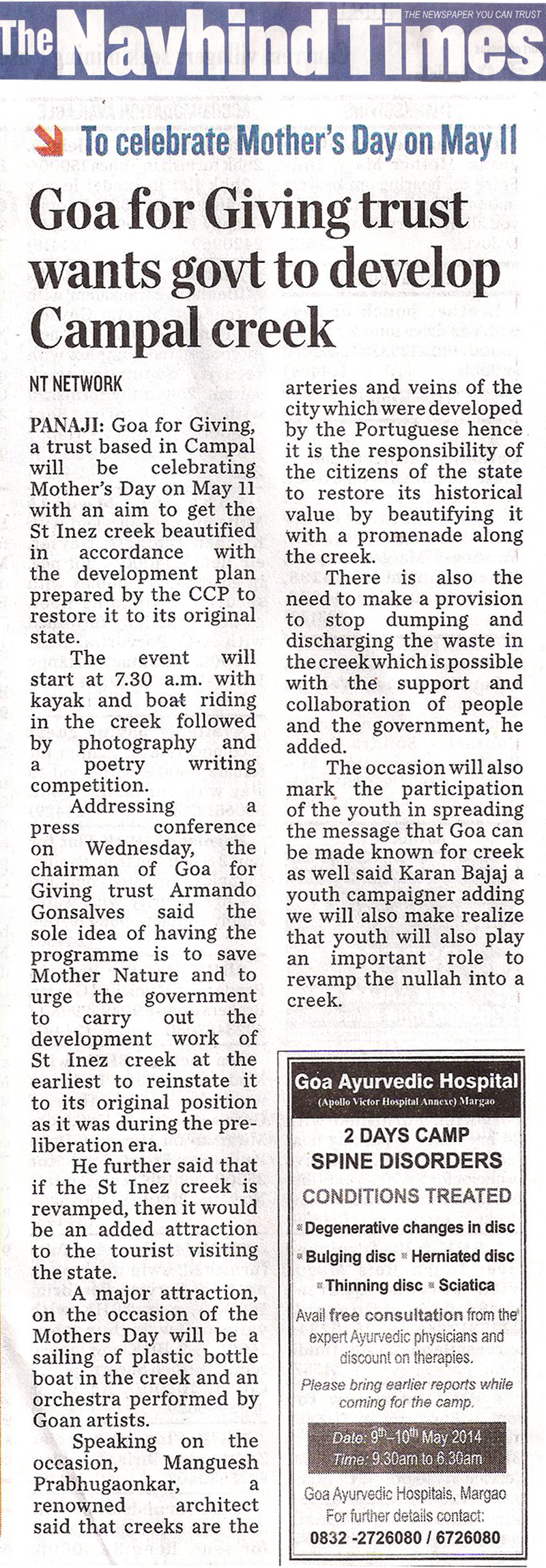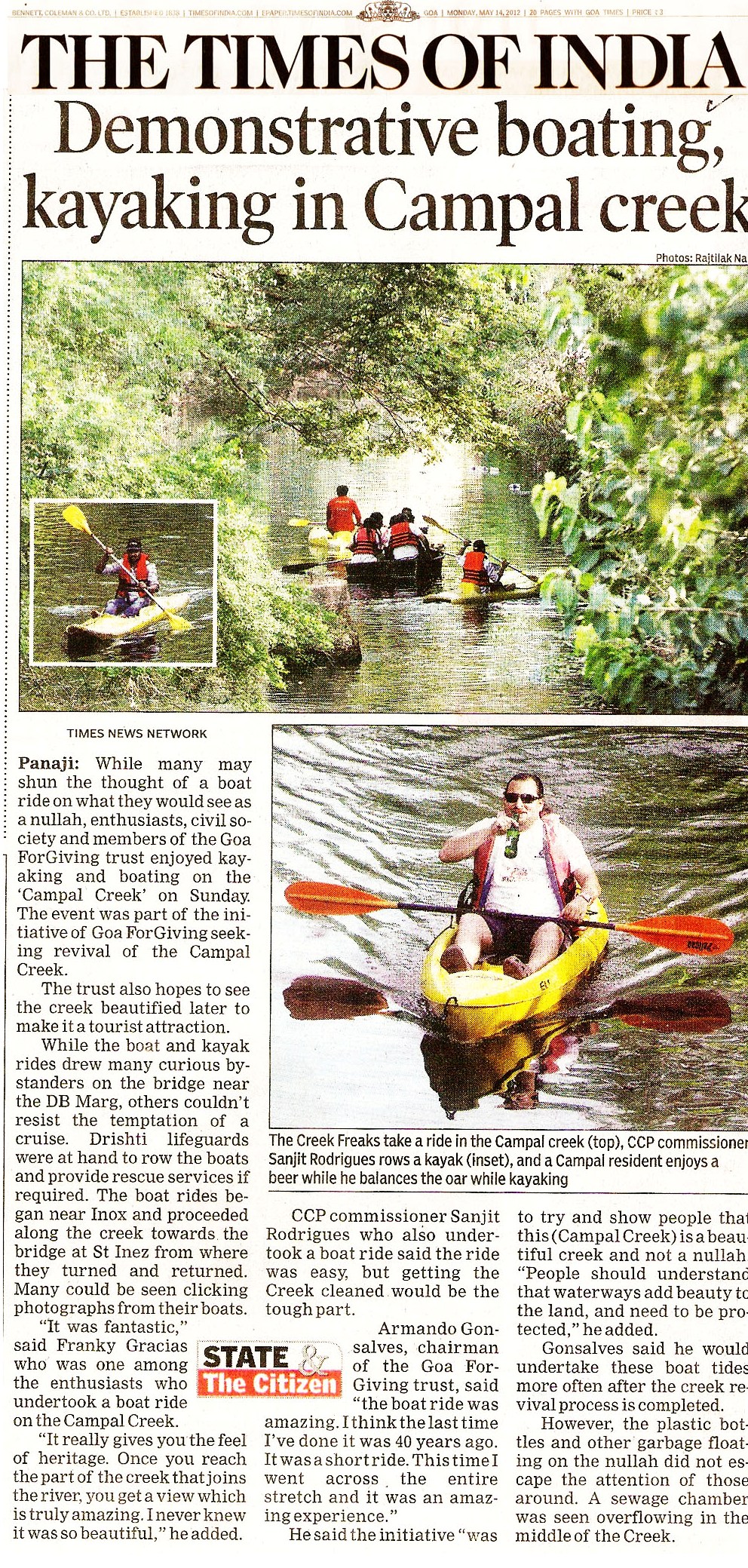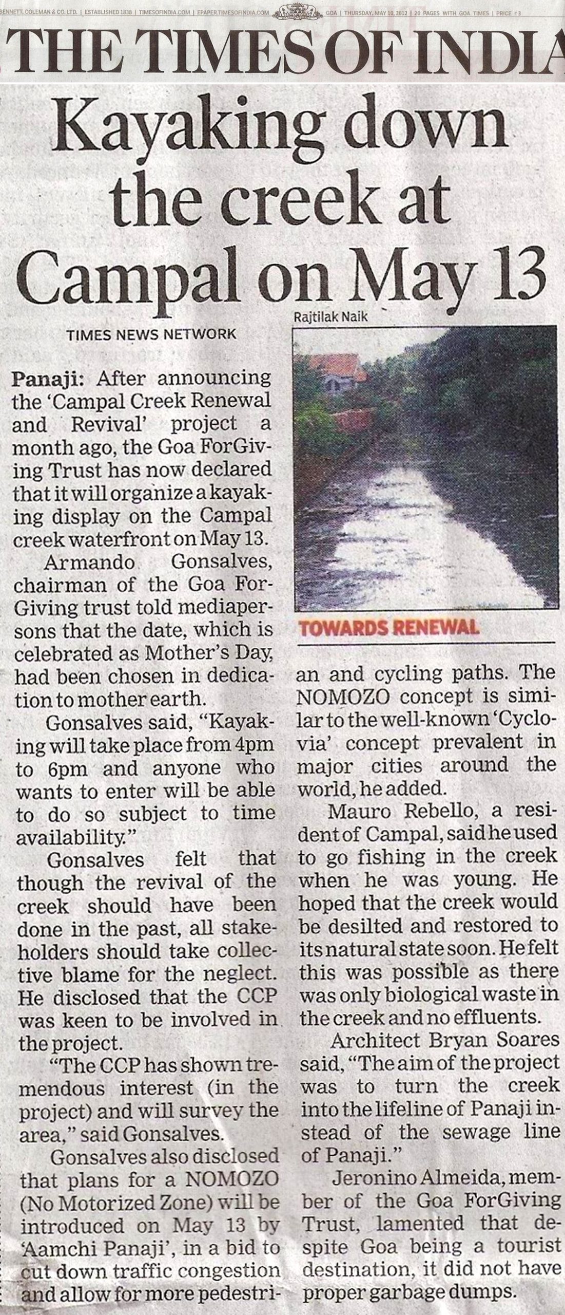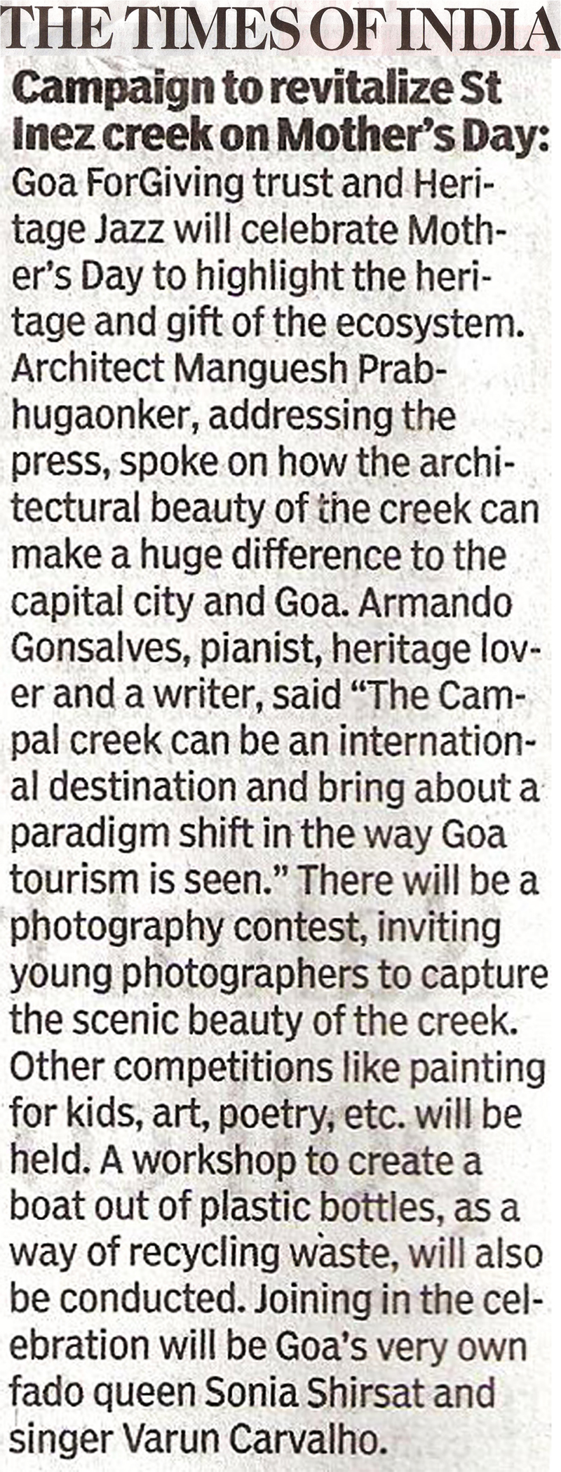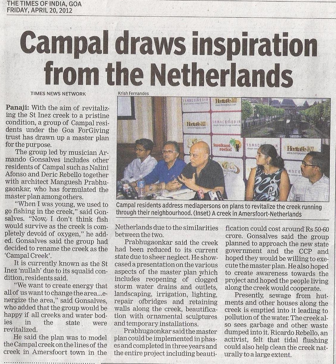 There are probably just a few individuals who may be aware that in the heart of the city of Panaji there is a water canal connecting Campal & St. Inez. The Campal Creek also known as St. Inez nullah opens up opposite Inox, squeezes in behind the heritage structures in Campal, flows besides Taj Vivanta, rests at St. Inez in the form of stagnant polluted water. To say the least it’s in a very sorry state. In an initiative to clean up and restore the Campal Creek, we at Goa ForGiving are mobilizing local residents on either side along the CAMPAL CREEK and people from across Goa to communicate and get together for a cause.