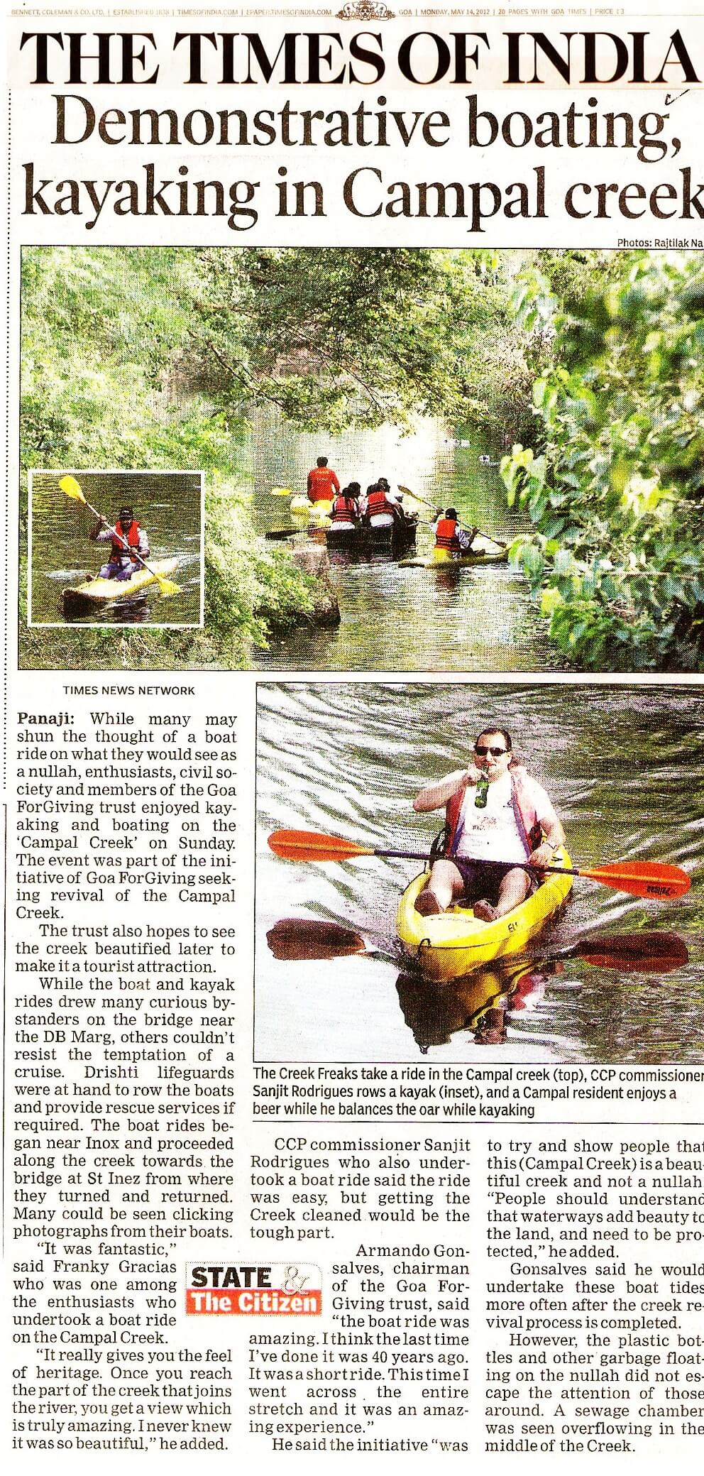 On Mother’s Day, the 13th of May, we decided to get into the creek and have kayaks and dinghies in them. CCP Commissioner Mr. Sanjit Rodrigues decided to pilot one such kayak, and there were many other citizens of Panjim and elsewhere including our Chairman Mr. Armando Gonsalves and others, who participated in the proceedings. Our endeavour was to make people realize that the Campal Creek is a creek, and not a nullah, and that it is well on the way of getting back to its pristine best. Once the people understand that there is a paradigm shift in the thinking process of Civil Society and the Government of Goa, besides the all-important Corporation of the City of Panjim, the rest is that much an easier ride to success. And the idea of having this on Mother’s Day was apt, since it was decided that we as a responsible organization, will dedicate this to Mother Earth.