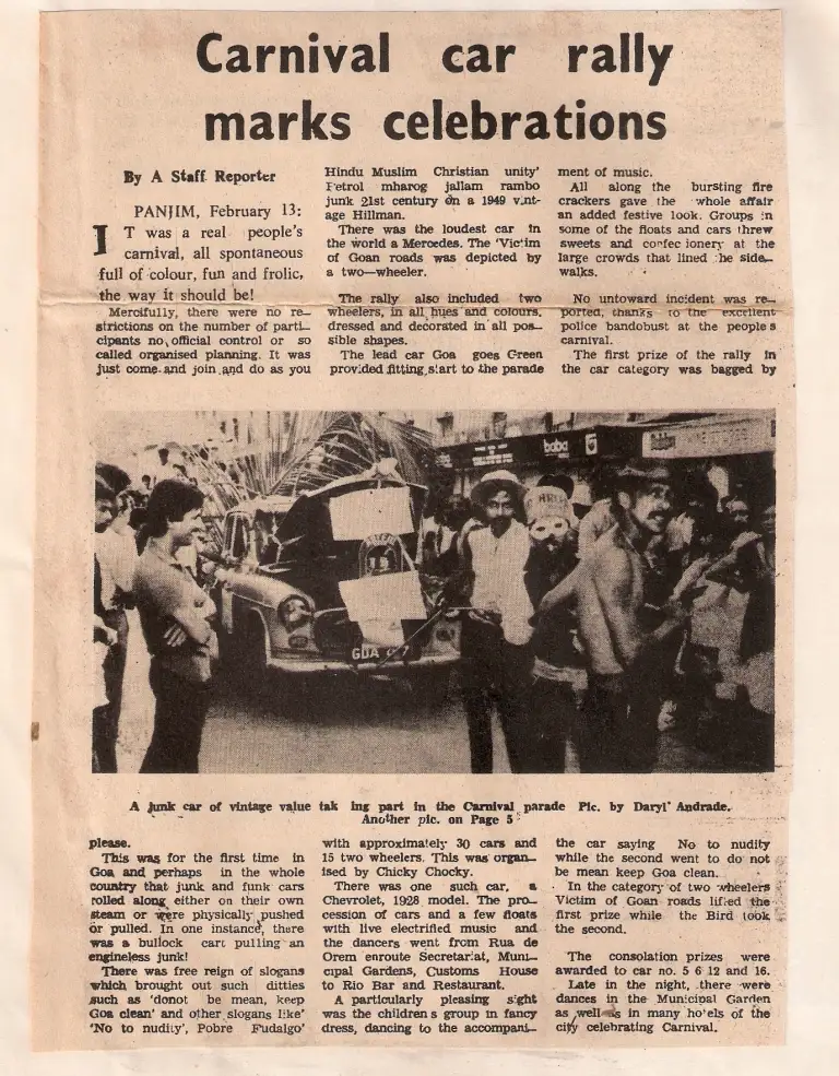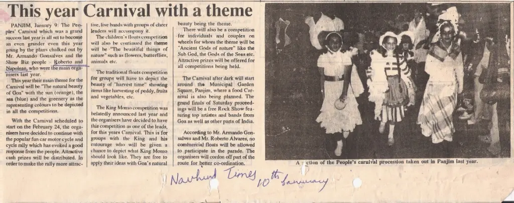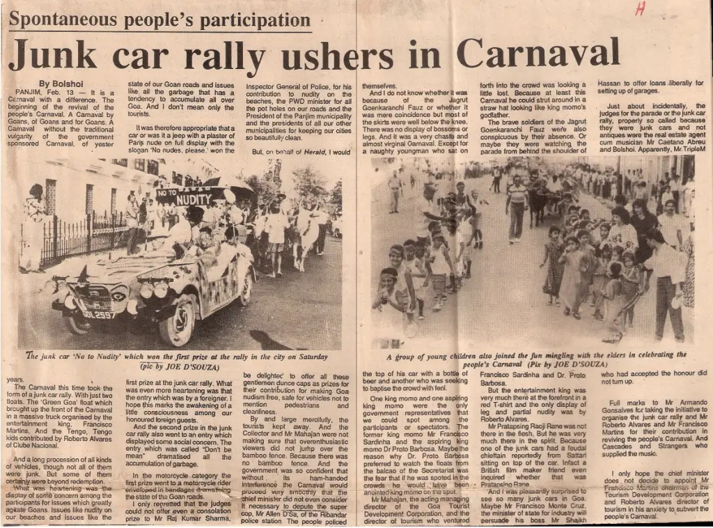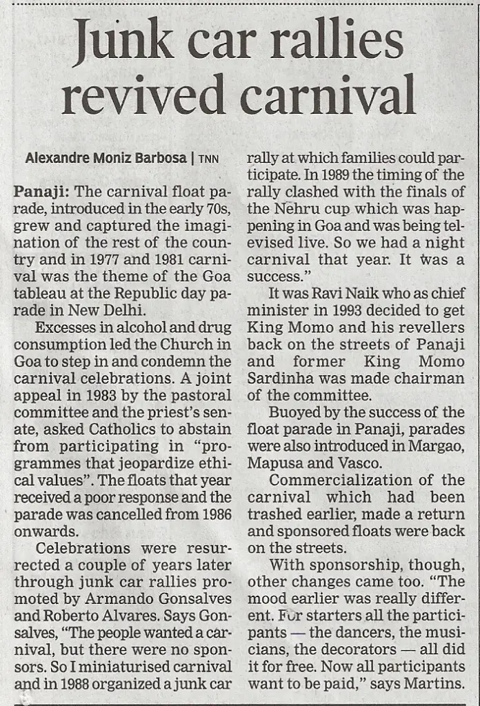 Many don’t even know that Carnival had reached a dead end in the years 1985 to 1987 when the Pastoral Committee at the Catholic Church gave out a call for boycott of the festivities since it was not Catholic in nature. The people stayed off the celebrations as a result, with 1985 being a Carnival with lukewarm response from the people, and with a total boycott in 1986 and 1987.The unique event that was conceptualized by us many years ago and which revived the Carnival in 1988. ‘People’s Carnival’ as we called it, was about people of different walks of life participating in small groups of friends, family and relatives. No commercial floats were allowed, and themes that were close to the heart of Goa were encouraged. Whether it was the environment, or “No to Nudism” or “No to drugs and alchohol”….the themes were reminiscent of the themes that touched Goan hearts at that time, and which continue to haunt the Goan way of life to this day.