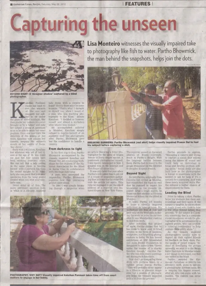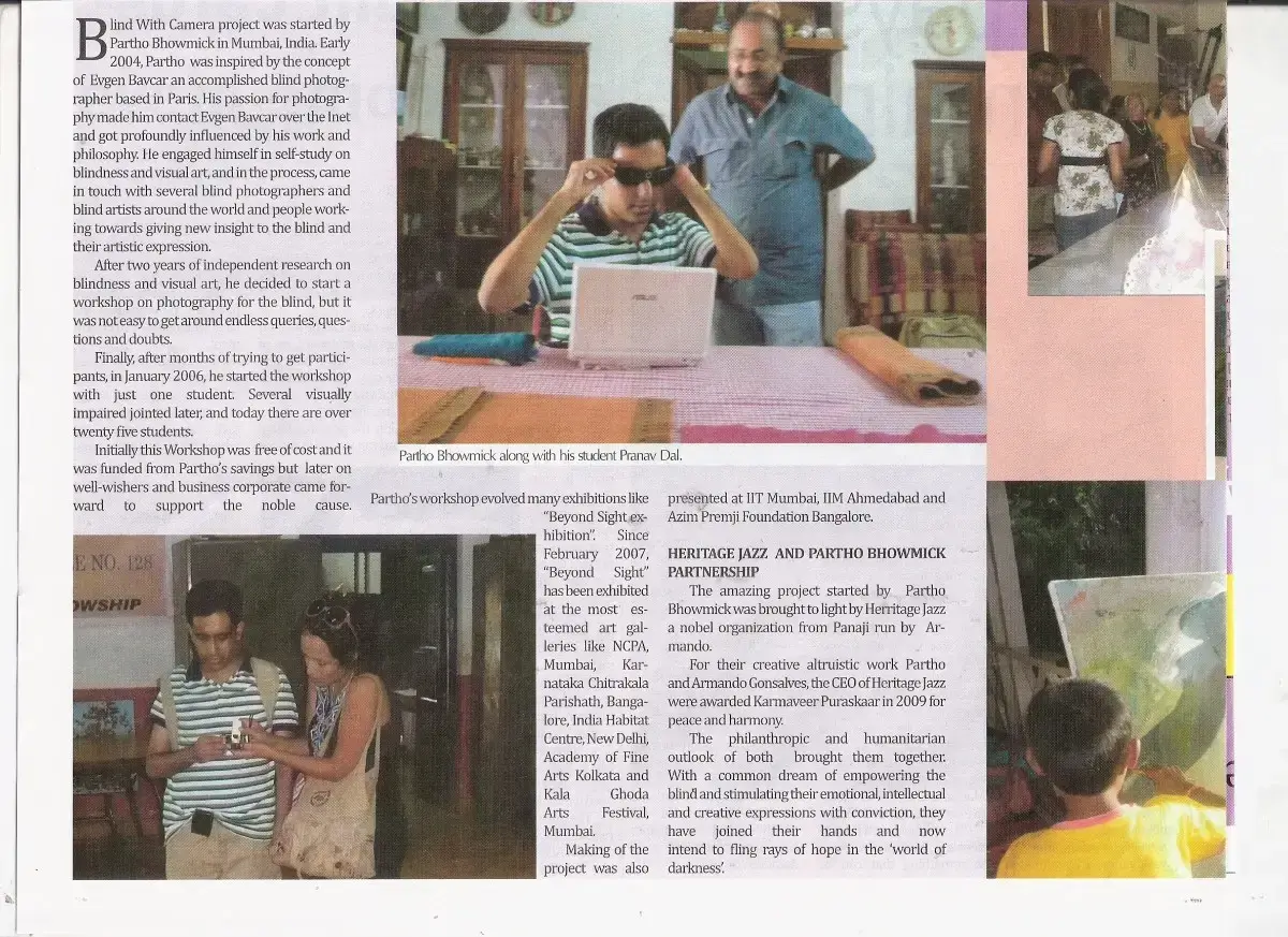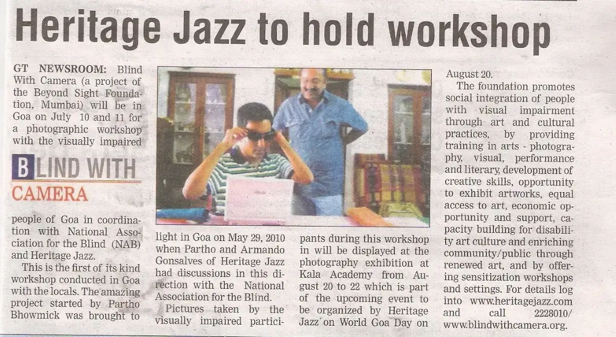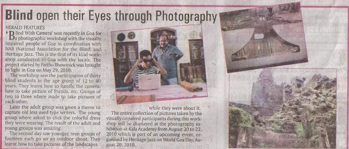 Blind With Camera (a project of the Beyond Sight Foundation, Mumbai) was in Goa on 10th & 11th July for a photographic workshop headed by Partho Bhowmick along with the visually impaired people from Goa. This was the first of its kind workshop conducted in Goa with the locals. The workshop was conducted in coordination with NAB (National Association for the Blind), Goa and supported by Heritage Jazz, Goa. Pictures taken by the visually impaired participants during this workshop were part of photo exhibition at the Kala Academy from 20th – 22nd August 2010.